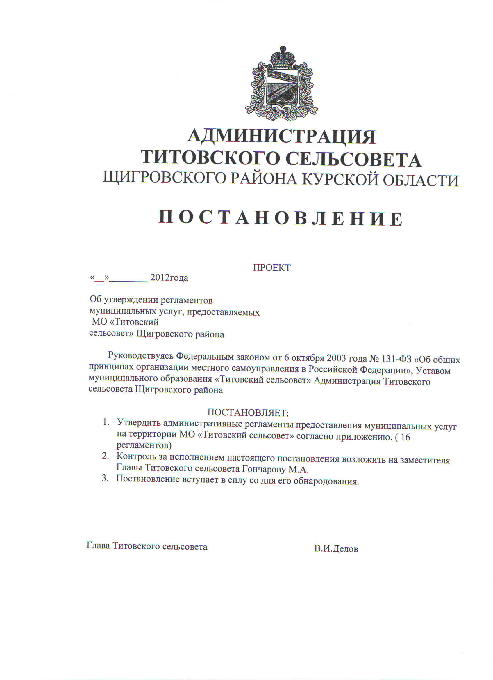 Постановление о утверждении регламентов муниципальных услуг, предоставляемых Титовским сельсоветом Щигровского района Курской области.